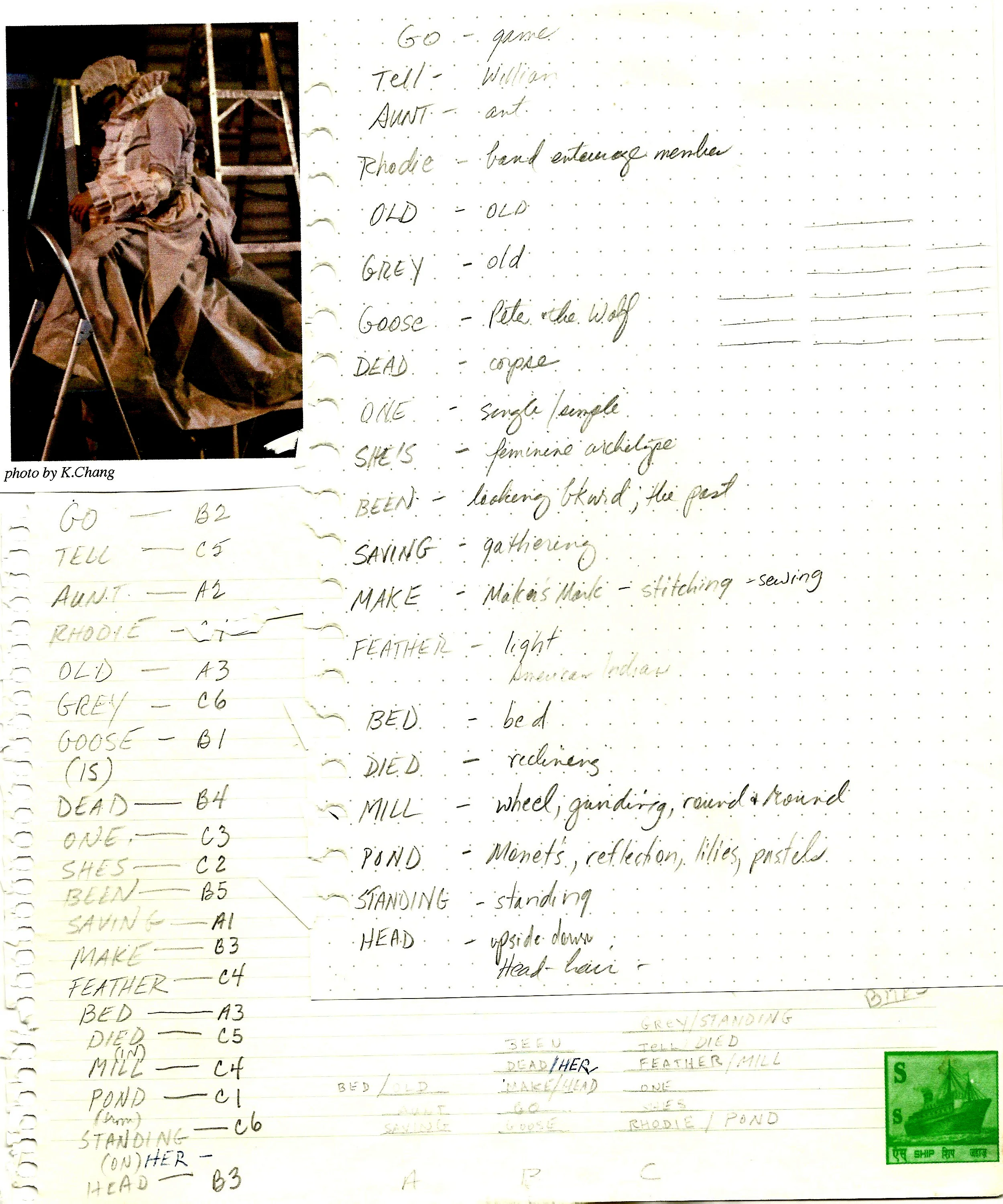 Each word from the lyrics of Go Tell Aunt Rhodie is randomly assigned (i.e. drawn from a hat) a rung on one of three ladders. The dancer follows the sequence of the lyrics, moving from rung to rung as directly as possible while still choosing her timing and allowing the play of images and emotions. The dance lasts between 15-45 minutes, depending on how many times the dancer chooses to repeat the score.